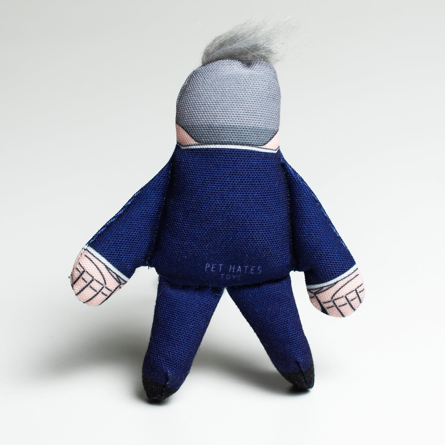 Keir cat toy with a real-life looking silver quiff of hair, made from plush fabric.Ā