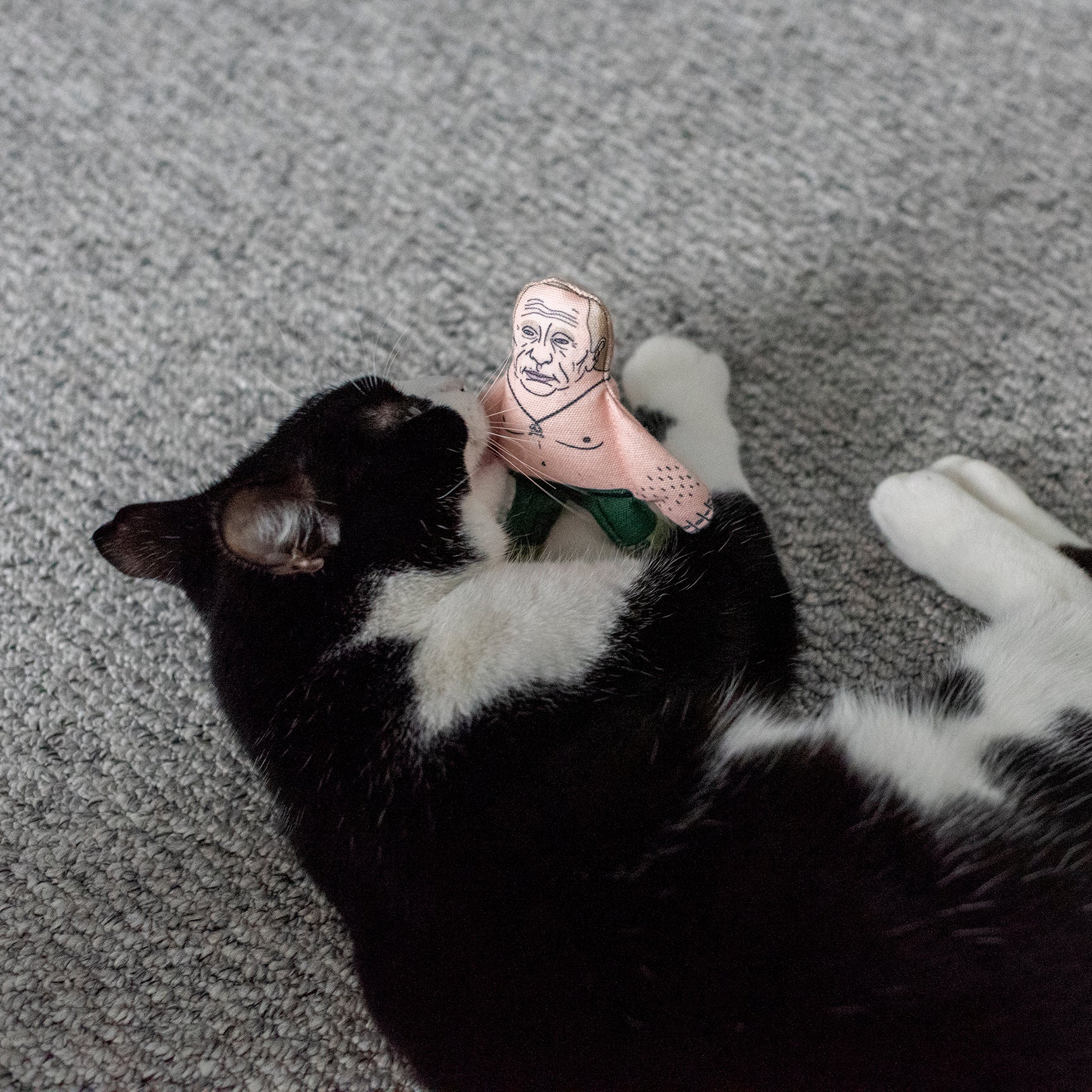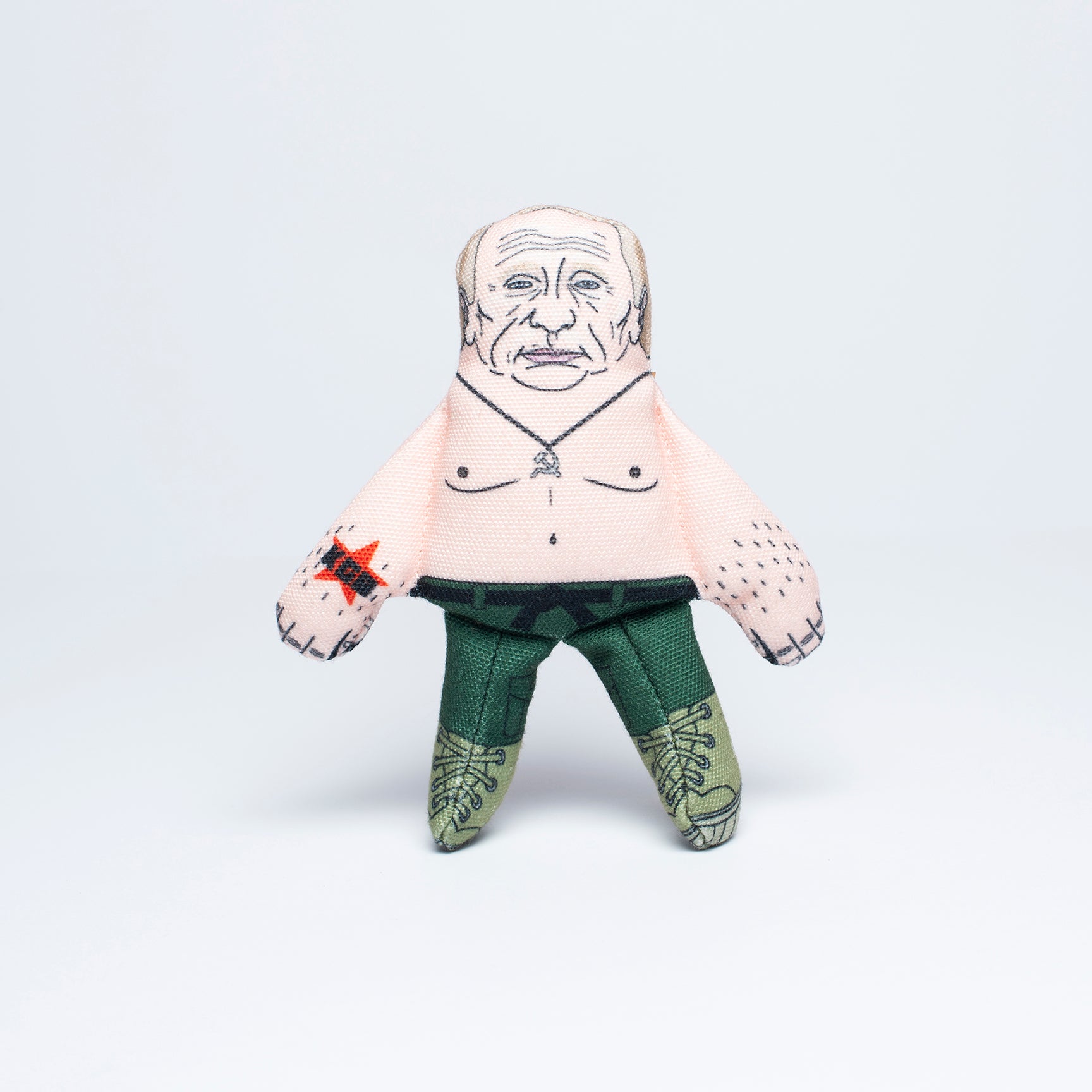 • Bare chested parody Vladimir Putin catnip cat toy.